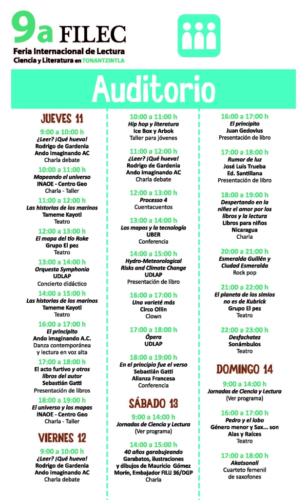 Puebla, Pue., a 3 de febrero.- Con una oferta cultural que incluye la presencia de más de 100 sellos editoriales, 40 talleres de ciencia y lectura, más de diez conciertos con grupos de primer nivel, 50 cuentacuentos, presentaciones de libros, una velada astronómica y un maratón de lectura, del 11 al 14 de febrero se realizará en Tonantzintla la novena edición de la Feria Internacional de Lectura (FILEC).