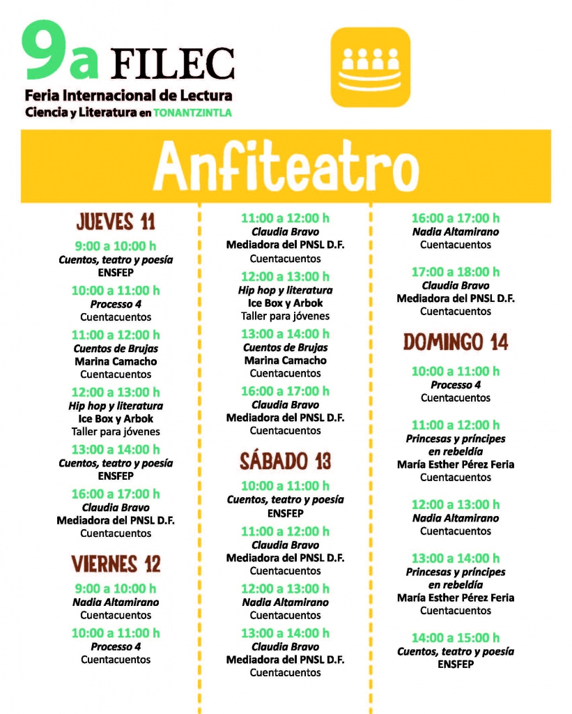 Destacó la participación del Programa Nacional Salas de Lectura, que instalará de nueva cuenta el Centro de Lectura, así como de la Dirección de Bibliotecas de la Benemérita Universidad Autónoma de Puebla (BUAP), que llevará a la FILEC una bebeteca y una comicteca: "Nuestra oferta cultural abarca a muchos públicos".