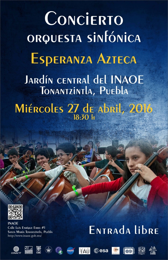 Estas conferencias serán gratuitas, al igual que el Concierto de la Orquesta Sinfónica Esperanza Azteca el día 27 de abril a las 18:30 horas, en el jardín central del INAOE. Esperanza Azteca es un proyecto para niñas, niños y jóvenes de escasos recursos de entre 5 a 17 años de edad, los cuales han desarrollado capacidades musicales de gran reconocimiento, lo que les ha permitido participar en eventos de talla mundial.