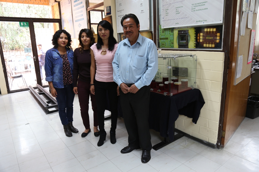 Parte del equipo científico de PolyMEMS INAOE. De izquierda a derecha: Maricruz Vargas Toxqui, María Luisa Monterrosas Andrade, Natiely Hernández Sebastián y el Dr. Wilfrido Calleja. Foto: archivo INAOE.