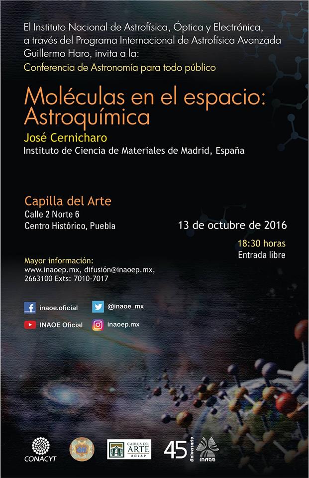 Asimismo, en el marco de esta Escuela Internacional, el Dr. José Cernicharo, del Instituto de Ciencia de Materiales de Madrid (ICMM-CSIC), impartirá la charla de divulgación Astrofísica molecular este jueves 13 de octubre en la Capilla del Arte de la UDLAP.